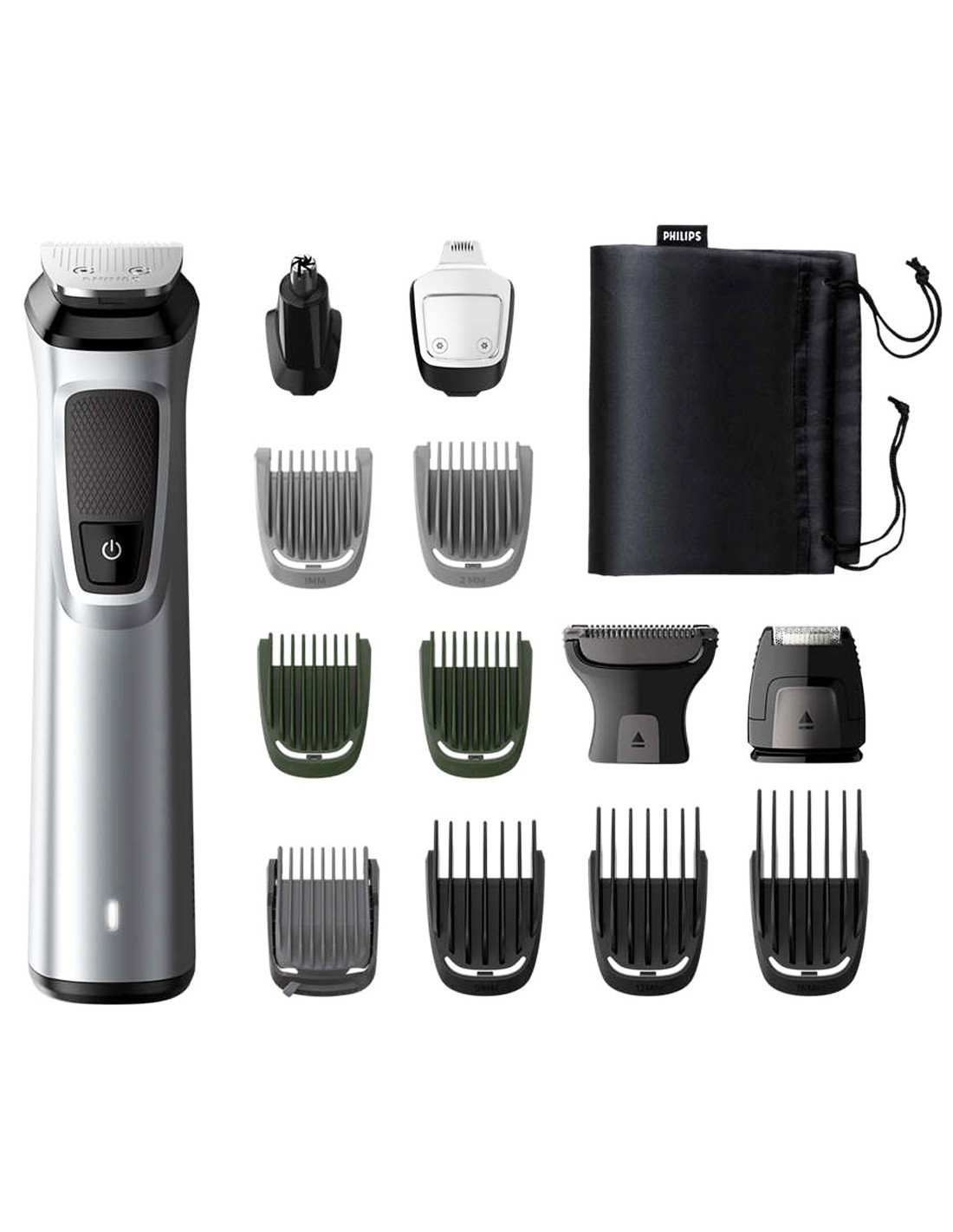 Multigroom Serie 7000 14-in-1, Gesicht, Haare und Körper Ultimatives Styling und Präzision Perfektionieren Sie Ihren persönlichen Stil mit unserem präzisesten und vielseitigsten Trimmer. 14 erstklassige Werkzeuge ermöglichen es Ihnen, Ihren einzigartigen Stil zu kreieren - von Kopf bis Fuß. Genießen Sie maximale Präzision mit den DualCut-Klingen und zusätzliche Kontrolle mit einem rutschfesten Gummigriff.