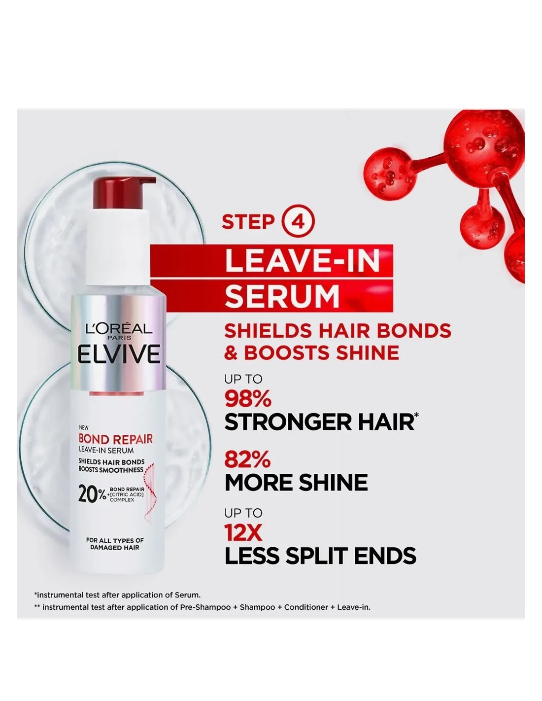 "L'Oréal Paris Elvive Bond Repair Leave-In Serum" 150 ml revoliucinės technologijos dėka apsaugo plaukų pluoštą ir atkuria visų tipų pažeistus plaukus.